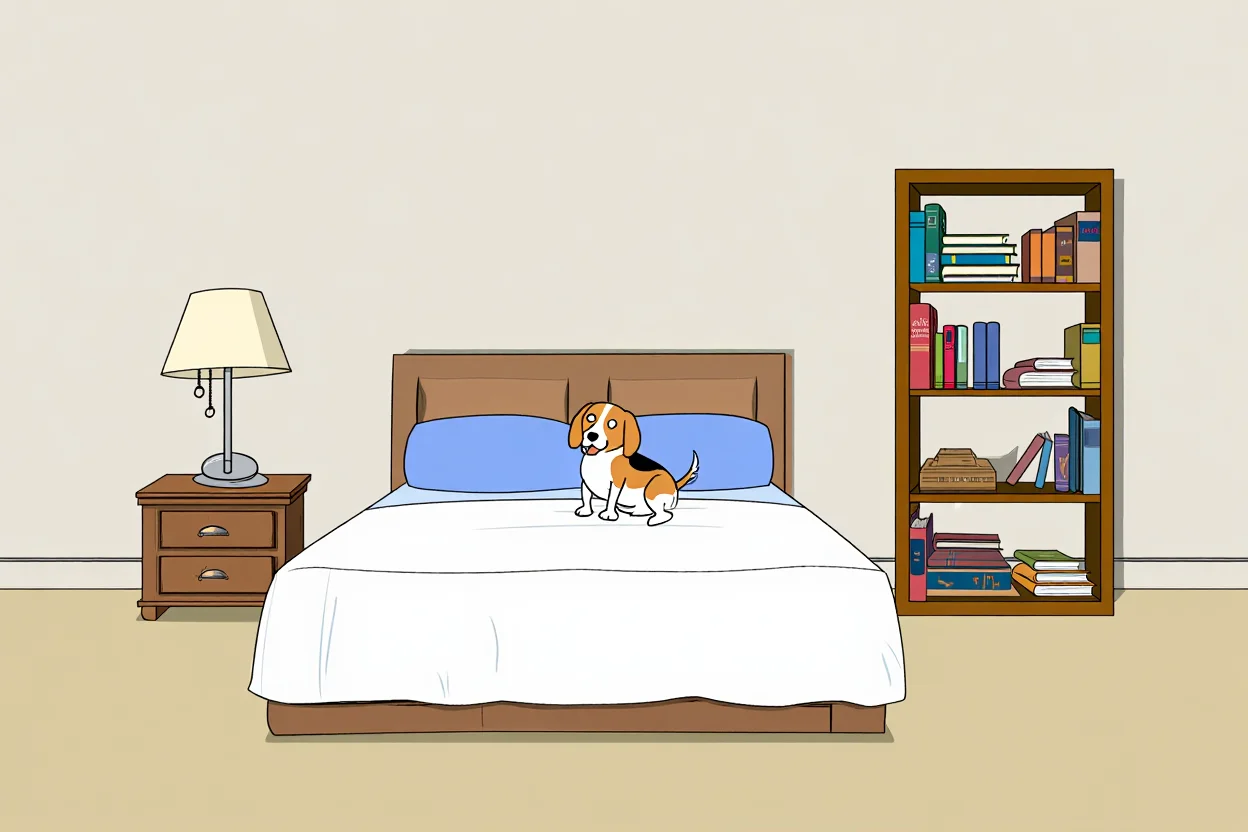 | "a cozy cartoon setup with a bed, beside table, lamp, bookshelf, and a small dog on the bed." |
