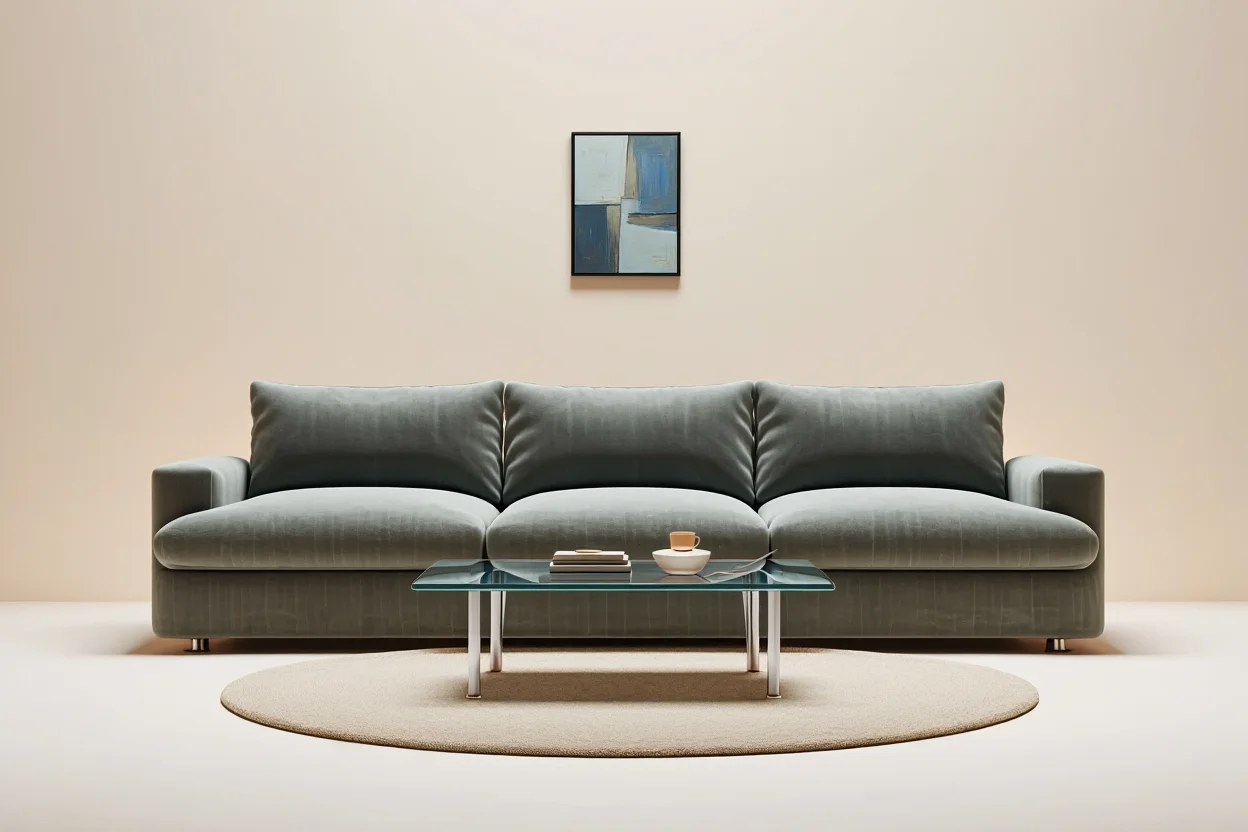 | "a luxurious CG scene with a couch, coffee table, small art piece, a cozy rug." |