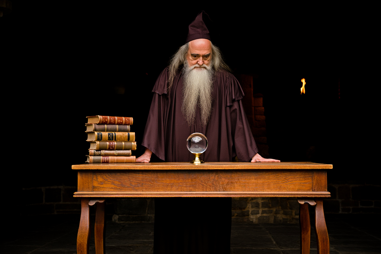 | "a Wizard standing in front of a Wooden Desk, gazing into a Crystal Ball perched atop the Wooden Desk, with a Stack of Ancient Spell Books perched atop the Wooden Desk." |