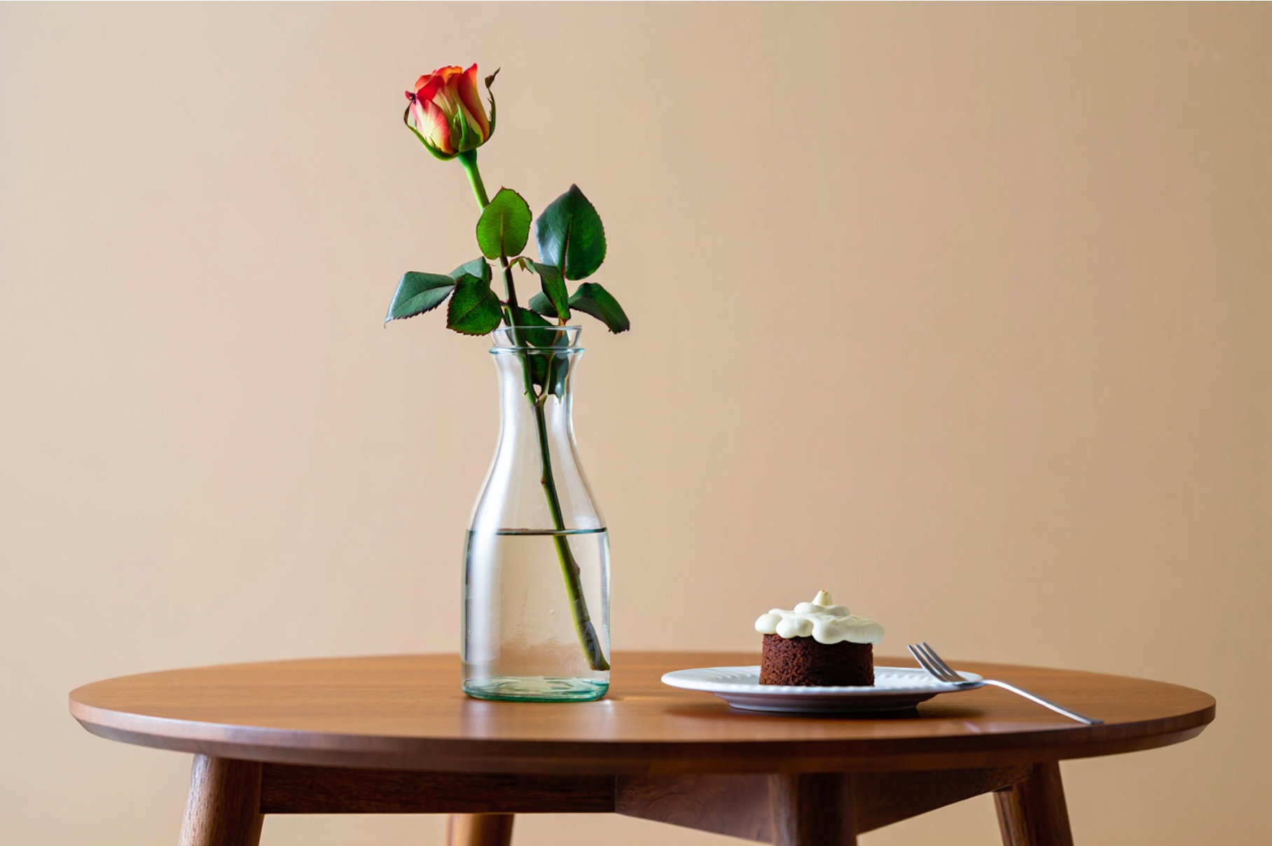 | "On a table, there is a vase with a bouquet of flowers. Beside it, there is a plate of cake." |