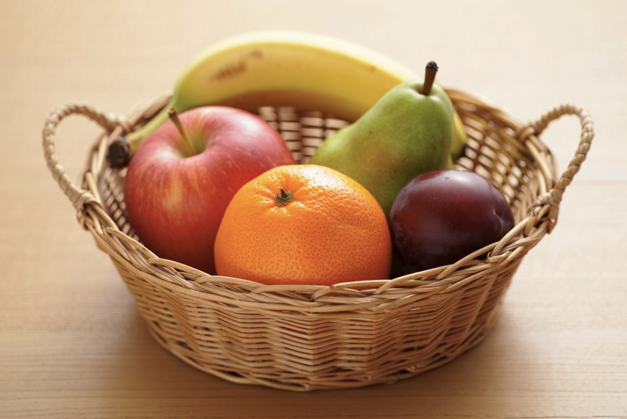 | "Horizontal perspective, showing the complete objects. In a basket of fruit, there are 5 fruits." |