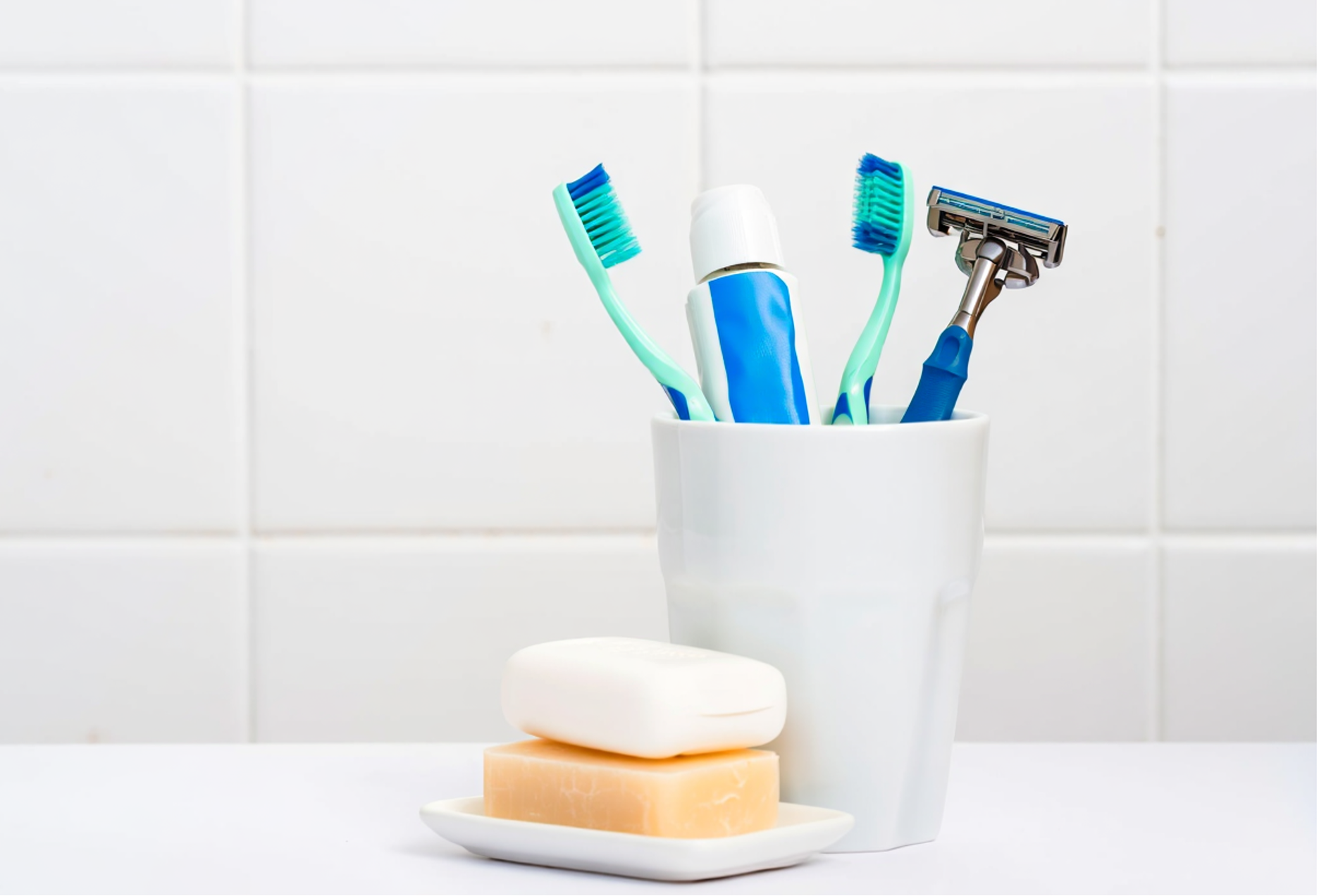 | "A white ceramic cup holds two blue and green toothbrushes, a blue and white toothpaste tube, and a blue-handled razor, while a white soap dish beside it contains two bars of soap—one white and one beige." |