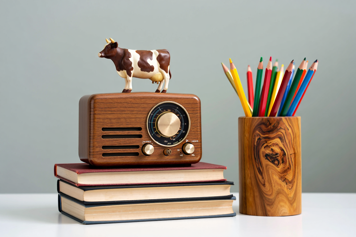 | "A vintage wooden radio with a small cow figurine on top sits on a stack of three hardcover books, next to a wooden cup holding colorful pencils." |