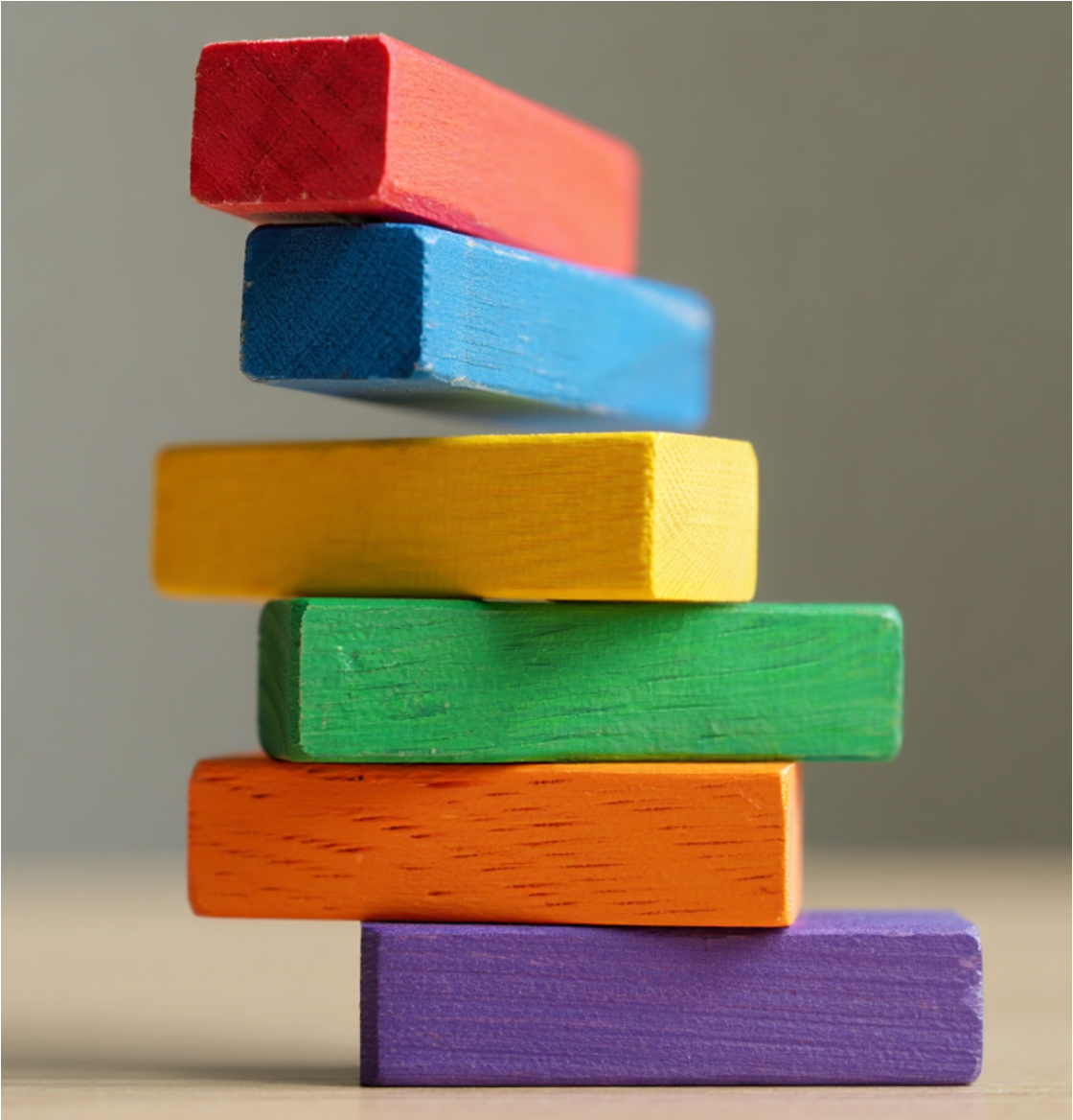 | "A stack of colorful wooden blocks arranged vertically, featuring red, blue, yellow, green, orange, and purple pieces, balanced on a flat surface." |